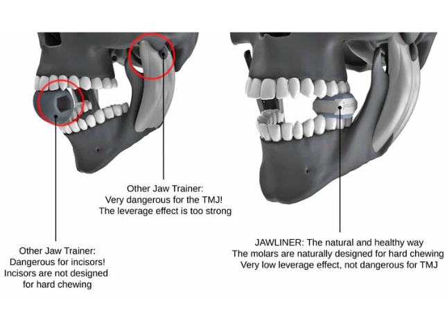 Deliberately, we have developed our JAWLINER in a natural way - unlike other Jaw Trainers with the known health problems. The JAWLINER stimulates the chewing muscles in a natural and healthy way without putting more strain on the jaw joint (TMJ) than eating a tough piece of meat. The mouth does not open more than necessary during training and exerts pressure with the molars, which are designated for that task. More detailed information can be found in our blog article on the subject of health.